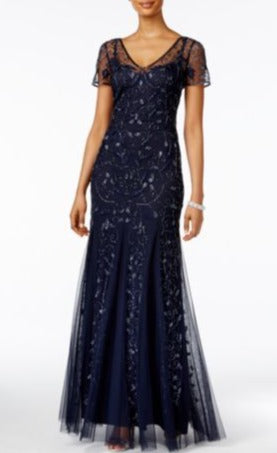 Navy Blue Short Sleeve V Neck Beaded ADRIANNA PAPELL Evening Gown